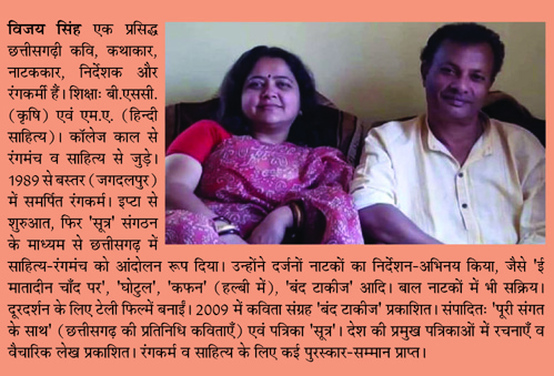 सामग्रीछपने के बाहर भेजते हैं उनका कहना है मुझे अभी और अच्छालिखना है, सिर्फ छपने और नाम होने के लिये मैं लिख नहीं सकता…मुझे विजय की जीवटता अच्छीलगती है सृजनात्मक कार्यों के लिए विजय जूझने से नहीं डरते कई बार एक साथ बहुत सारी जिम्मेदारी उठा लेते हैं तब मैं नाराज होती हूं तो हँस देते हैं। हांलाकिवे अपने सभी कार्यो को पूरी प्रतिबद्धता से पूरा करते हैं। कई बार मैं सोचती हूं एक अकेला आदमी कैसे एक साथ इतना काम कर लेता है। कभी पत्रिका निकालनी है, तो कभी सूत्र सम्मान की तैयारी करनी है तो कभी बच्चोंके लिये रंग कार्यशाला लगाना है, फिर आये ढेरों पत्रोंके नियमित जवाब देना फिर अपनी नौकरी की जिम्मेदारी को भी अनुशासित ढंग से निभाते हैं। विजय, चुप बैठकर