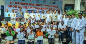 Yogasana championship : हिना पाल,समिला लहरे, एसोसिएशन के सचिव कुश साहू, उपाध्यक्ष मोहन सेनापति,कुंदनकुमार साहू, कुमार साहू,नरसिंह तेता ईश्वर साहू भूमिका महत्वपूर्ण रहा।कार्यक्रम के अंत मे अतिथियों को अंगवस्त्र व प्रतीक चिह्न से व समस्त सहयोगियों को प्रशस्ति प्रमाणपत्र व मोमेन्टो से सम्मानित किया गया।अल्पाहार में अंकुरित अनाज व दोपहर 2 बजे से खिचड़ी की पर्याप्त ब्यवस्था रही।कांकेर योगासना स्पोर्टस एसोसिएशन के उपाध्यक्ष मोहन सेनापति ने प्रतियोगिता सफल बनाने में प्रत्यक्ष अप्रत्यक्ष रूप से सहयोग प्रदान करने हेतु खिलाड़ियो ,प्रशिक्षको ,जजेस ,अतिथियो प्रतियोगिता स्पान्सरो ,न्यूज मीडिया अन्य सभी को शुभकामनाए एवं बधाईयां देकर आभार ज्ञापन कर समापन किए, कार्यक्रम का सफल संचालन विजय रॉय जी के द्वारा किया गया।