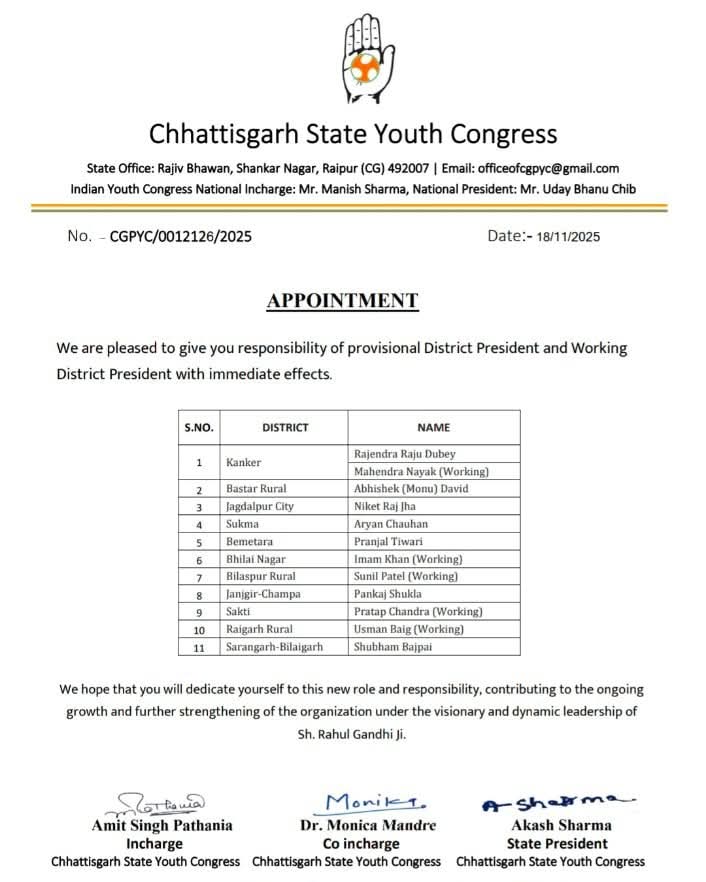 लंबे इंतजार के बाद युवा कांग्रेस ने अपने 11 जिला अध्यक्षों की घोषणा कर दी है. बस्तर ग्रामीण की जिम्मेदारी अभिषेक (मोनू) डेविड, जगदलपुर शहर निकेत राज झा तो भिलाई नगर के लिए इमाम खान को जिला अध्यक्ष बनाया गया है.